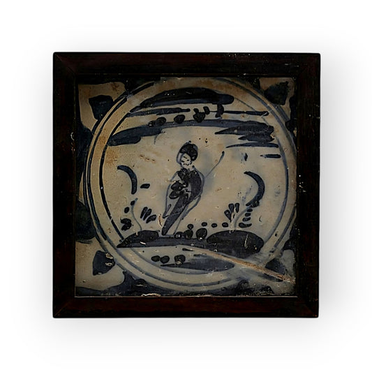 18th Century Spanish Antique Blue & White Tin-Glazed Earthenware Triana Tile / Majolica Tile Decorated With A Naively Stylised Female Figure