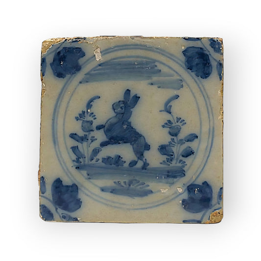 18th Century Spanish Antique Blue & White Tin-Glazed Earthenware Triana Tile / Majolica Tile Decorated With A Naively Stylised Rabbit