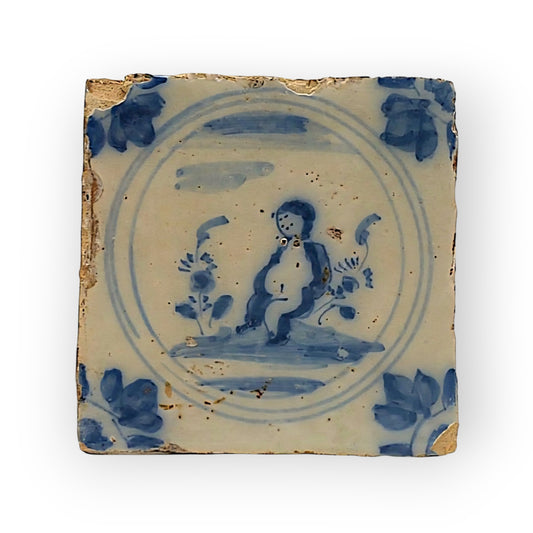 18th Century Spanish Antique Blue & White Tin-Glazed Earthenware Triana Tile / Majolica Tile Decorated With A Naive Image Of A Child