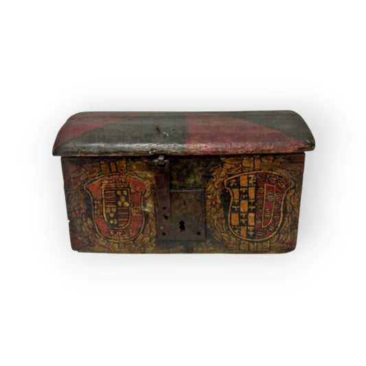 Early 16th Century Spanish / Iberian Antique Table Top Wedding Chest / Dowry Chest Bearing Two Noble Families Coats of Arms