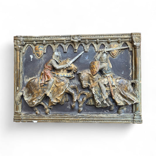 Medieval Style, English-Made Decorative Plaster Plaque Depicting Knights Locked in Combat