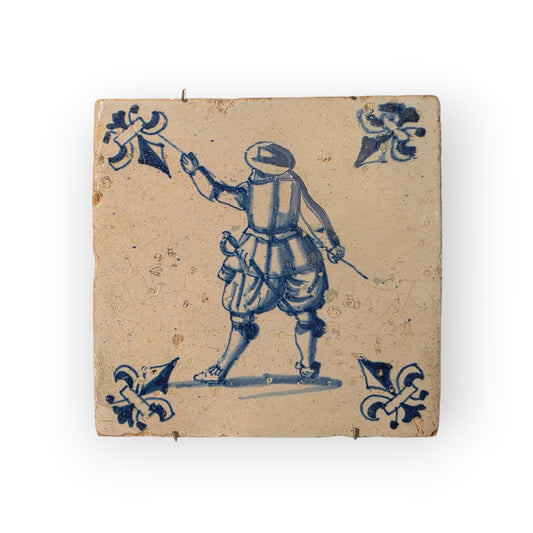 Early‑to‑Mid 17th‑Century Dutch Antique Delftware Tile Depicting a Soldier with Pike Drawn, circa 1625–1650