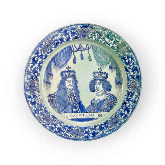 Late 17th-Century Dutch Antique Tin-Glazed Delftware King William III and Queen Mary Charger, circa 1690