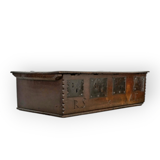 An Usual Quadruple-Lock Mid 17th-Century Charles II Period, English Antique Oak Boarded Box