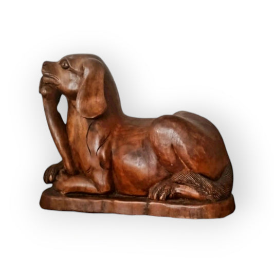 Large 19th Century Antique Folk-Art Carved Wooden Sculpture Of A Recumbent Dog With A Bone