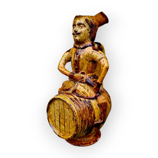 Large 18th-Century Antique Ochre-Glazed Earthenware Jug / Pitcher / Ewer In The Form Of "Man On A Barrel"