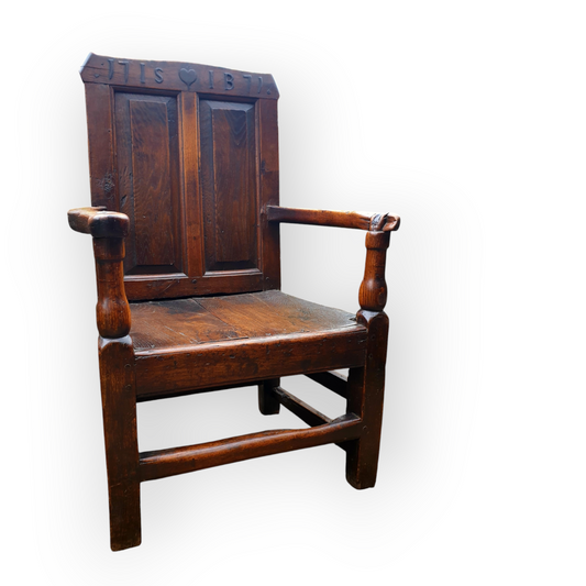 18th-Century Welsh Antique Oak Wainscot Armchair, The Cresting Rail Carved With A Love Heart, The Initials "IS" & "IB" & Dated "1771"