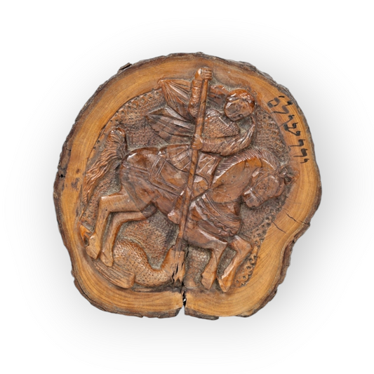 Diminutive 19th-Century Jerusalem Olive Wood Antique Carved Panel, Formed From A Trunk Cross-Section, Carved With A Depiction Of Saint George Slaying The Dragon