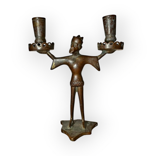 15th Century / Late Medieval Period German Antique Bronze "Bearded Man" Two Branch Candleholder / Candelabrum