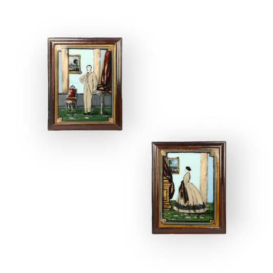 Rare Pair Of Primitive / Naive Mid 19th-Century American Antique Folk-Art Portrait Paintings On Glass