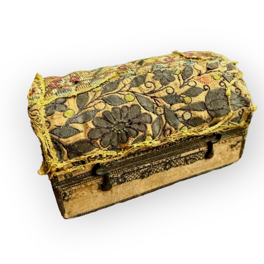 Diminutive 17th Century English Antique Embroidered Table Casket