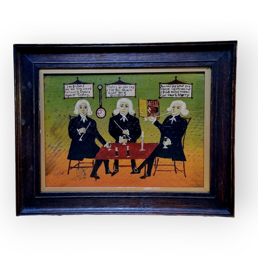 After The Original On Display at Compton Verney, A Naive 19th Century English School Antique Oil on Board Folk Art Painting Entitled "Three Sober Preachers"