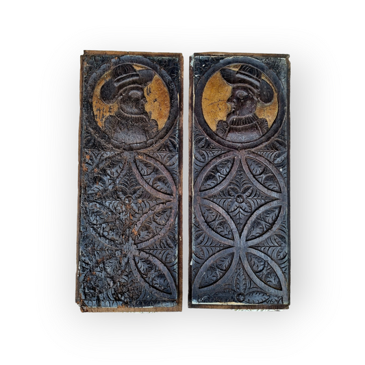 Pair of 16th Century Antique Carved Oak Romayne-Head Portrait Panels With Blind Gothic Tracery