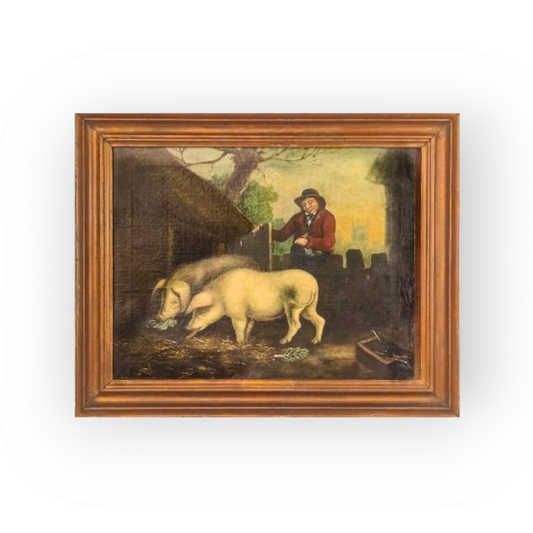 An Early 19th Century Primitive English School Antique Folk Art Oil on Canvas of Pigs in a Pigsty