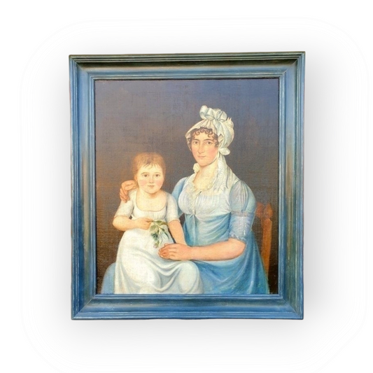 Late 18th Century Primitive English School Antique Folk Art Oil on Canvas Portrait of a Mother & Her Daughter, Circa 1790-1800