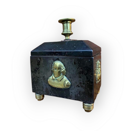 William Shakespeare Interest - A 19th Century English Antique Steel & Brass Tobacco Jar Decorated With Images of Shakespeare