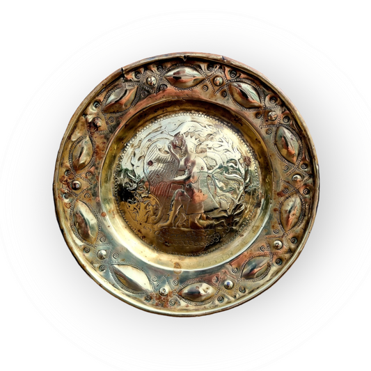 16th Century German Antique Brass Nuremberg Alms Dish Decorated with King David Playing a Harp