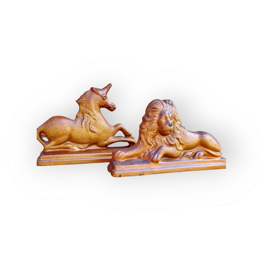 Pair of Large 19th Century English Antique Pottery Salt Glazed Stoneware Figures Depicting the Lion and Unicorn