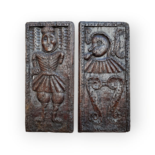 Pair of Large, Naive, 16th-Century Antique Carved Oak Portrait Panels