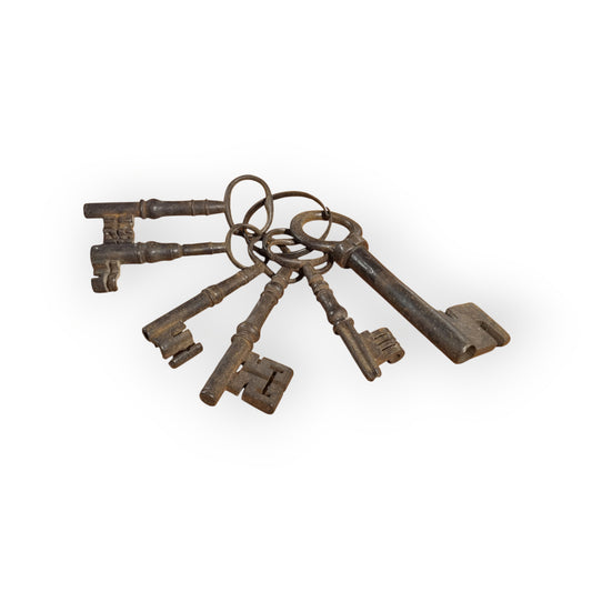 A Set Of Six Large 17th-Century & 18th-Century Antique Iron Keys With Their Original Key Ring