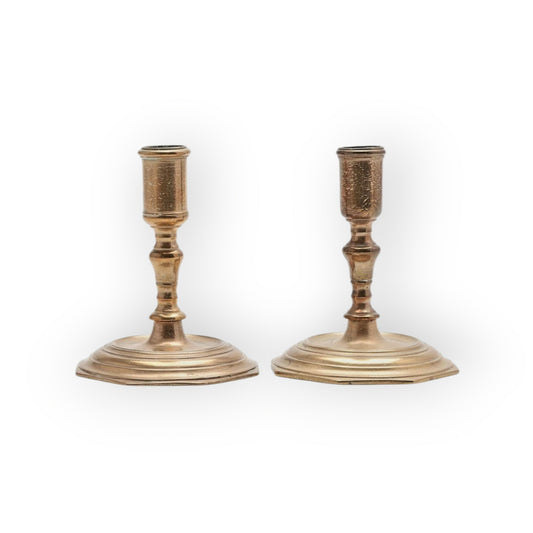 A Pair Of Early 18th-Century Baroque Antique Brass Candlesticks Of Squat Form