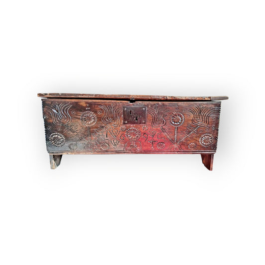 Late 17th-Century English Antique Oak Six-Plank Boarded Chest Dated "1695"