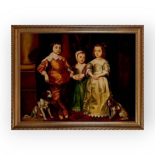 Follower of Van Dyck (1599-1641) - Early 19th Century English School Antique Oil On Canvas Portrait, In The 17th Century Manner, of The Three Eldest Children of King Charles I
