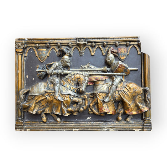 Medieval Style, English-Made Decorative Plaster Plaque Depicting Knights Jousting in Original Polychrome