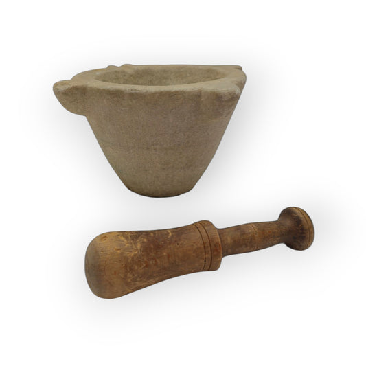 Early 17th-Century Antique Sandstone Mortar & Associated Wooden Pestle