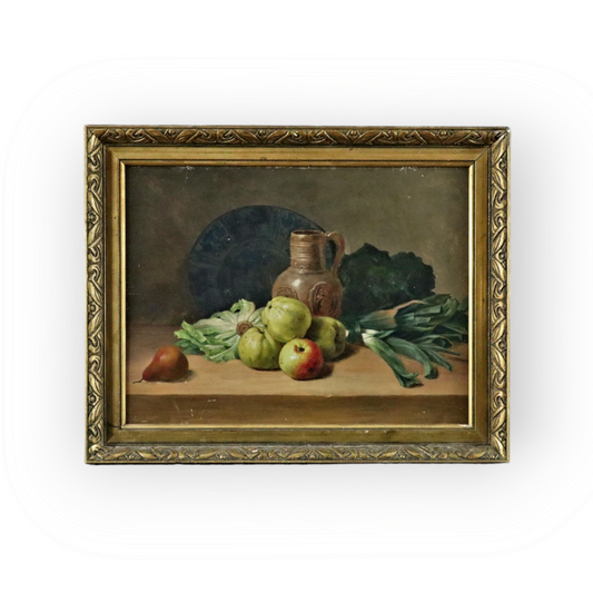 Stolen from our shop! 19th Century Flemish School Antique Still Life Oil Painting With Fruit, Vegetables, 16thC Raeren Stoneware Jug and Delftware Plate