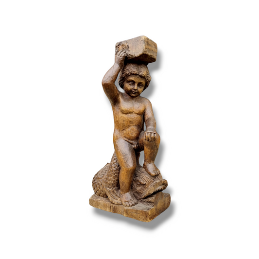 19thC Antique Carved Wood Sculpture of Palaemon, The Greco-Roman Sea God, Riding Upon A Dolphin