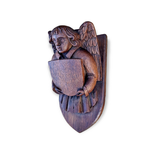 Late Medieval Style, 19th Century Made, English Antique Carved Oak Panel Depicting an Angel Bearing a Shield