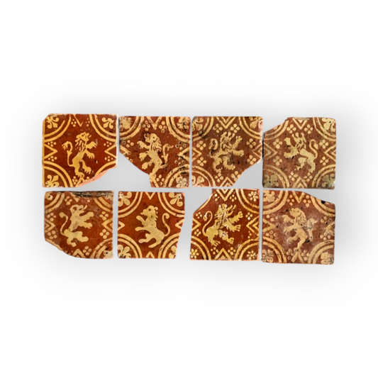 Eight 16th-Century Antique Earthenware Encaustic Tile Fragments, Each Featuring A Rampant Lion