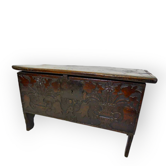Diminutive Early 17th-Century English Antique Oak Six Plank Coffer Later Inscribed "IR 1705"