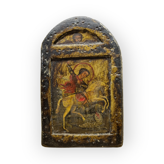 A Diminutive Early 18th-Century Orthodox Antique Travelling Icon of Saint George Slaying The Dragon