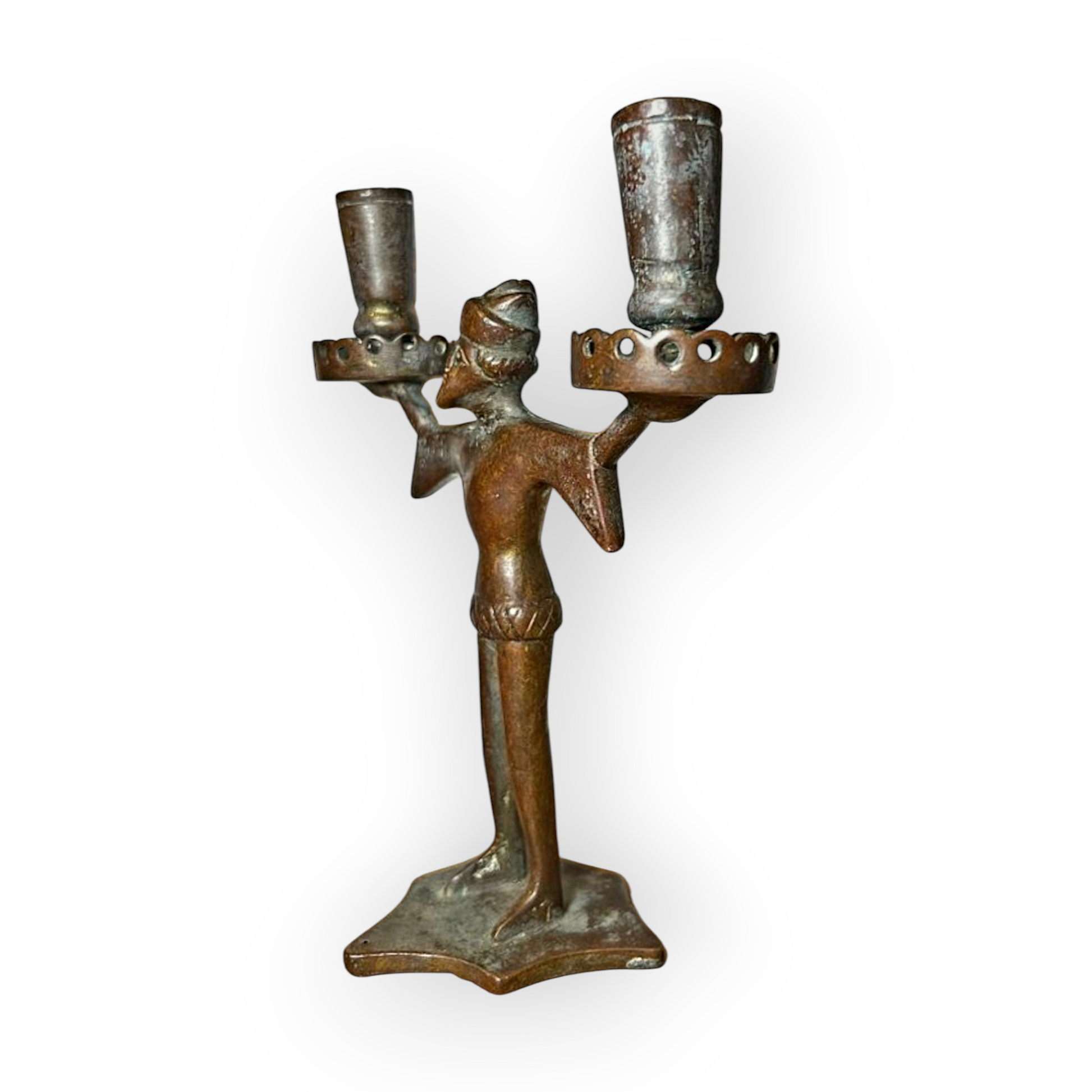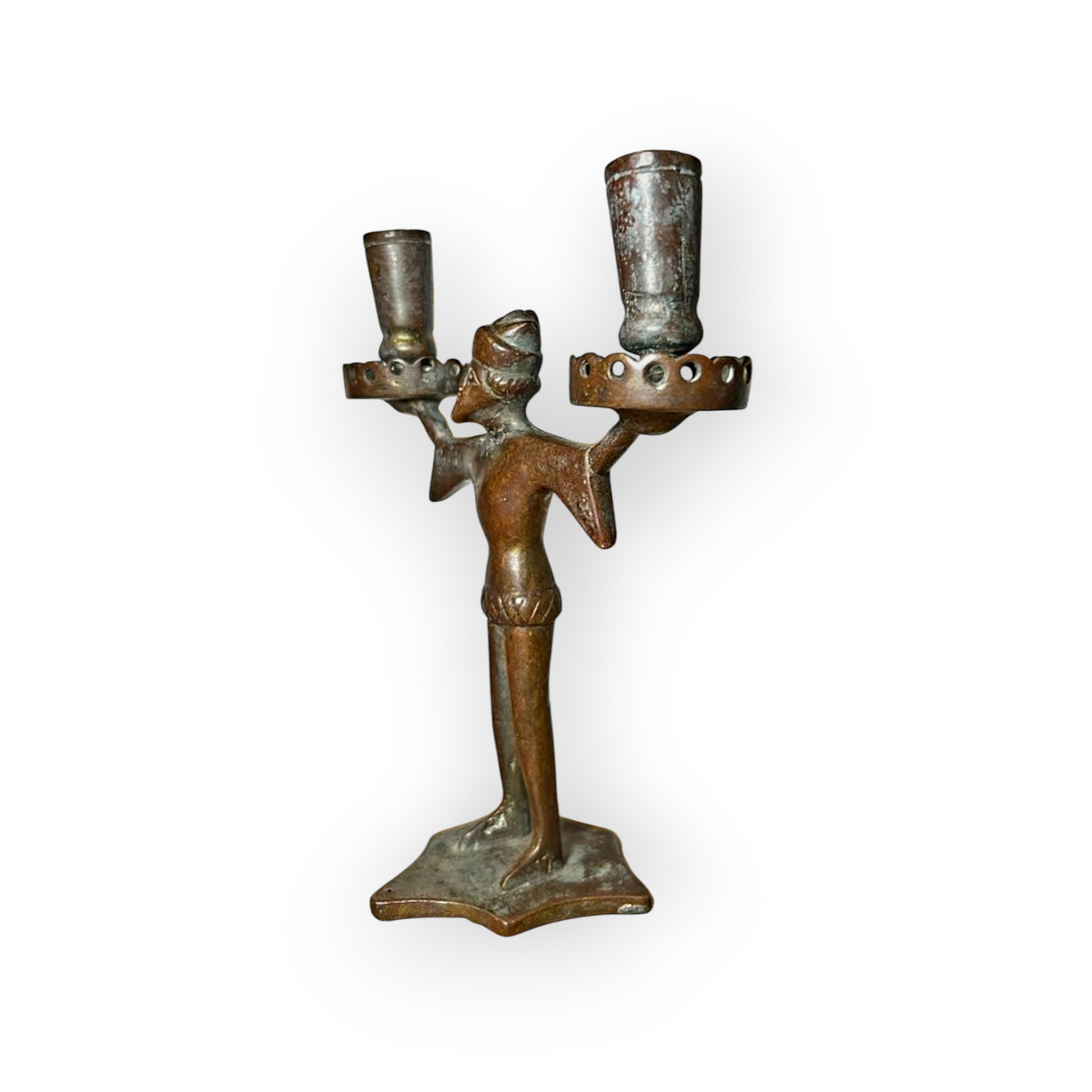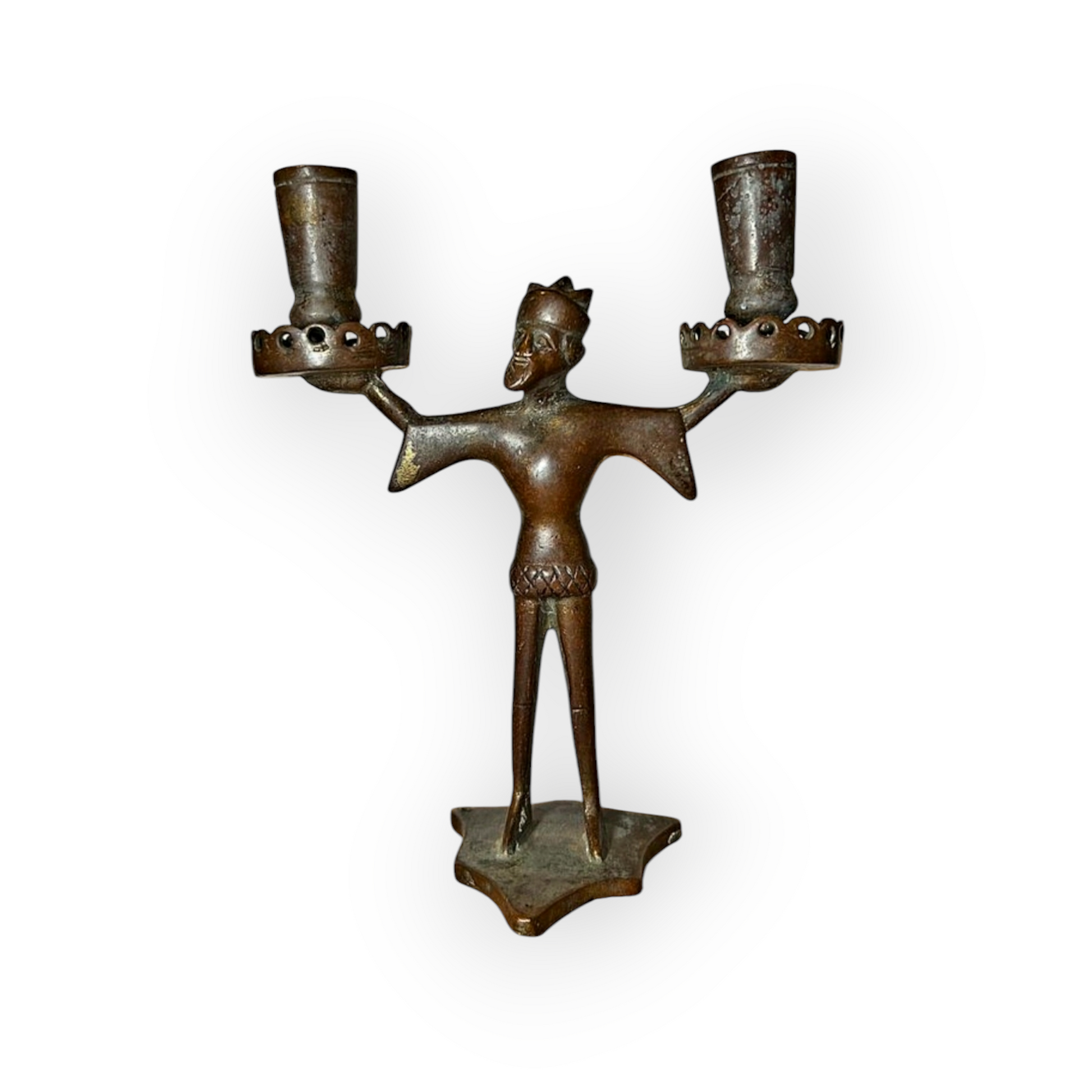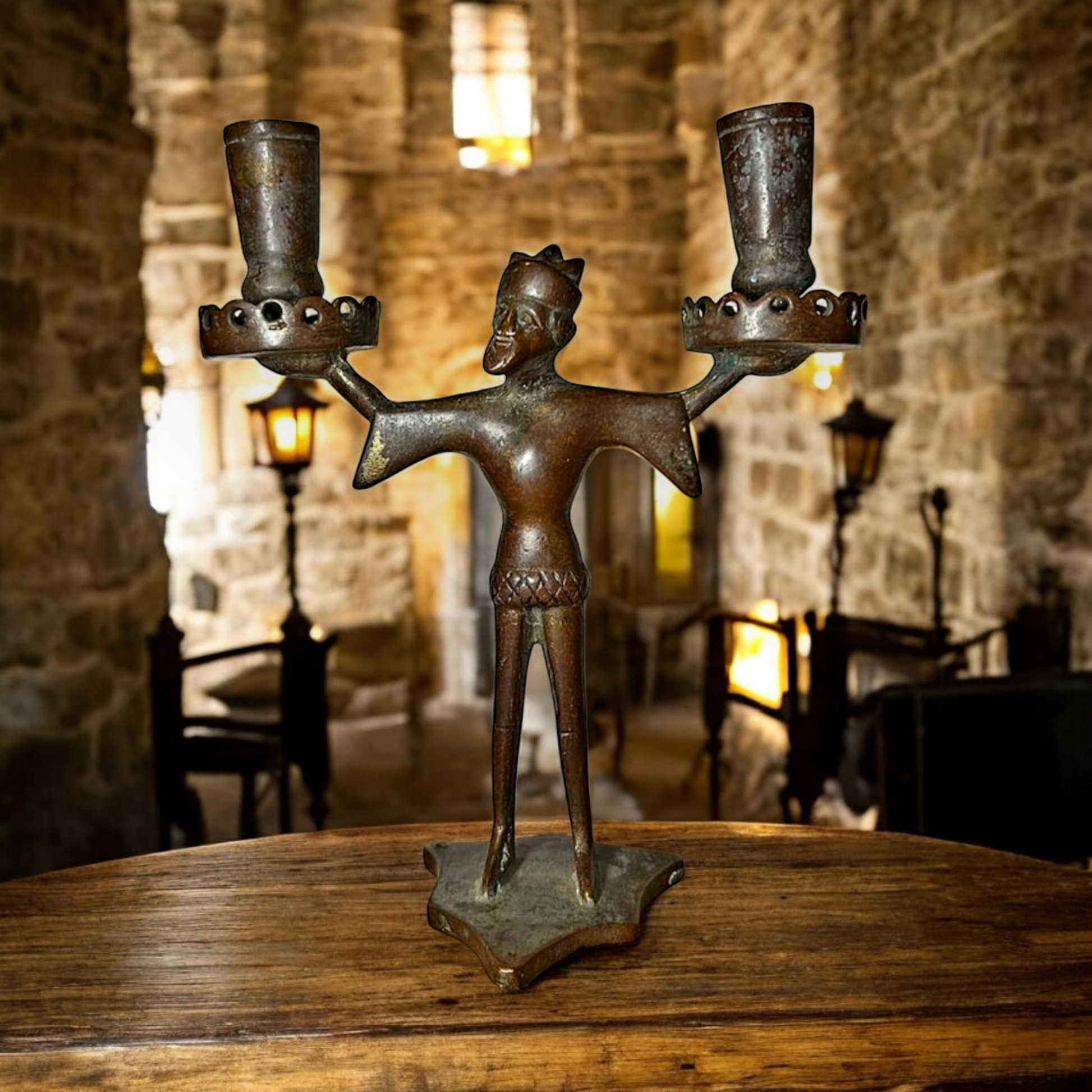 15th Century / Late Medieval Period German Antique Bronze "Bearded Man" Two Branch Candleholder / Candelabrum