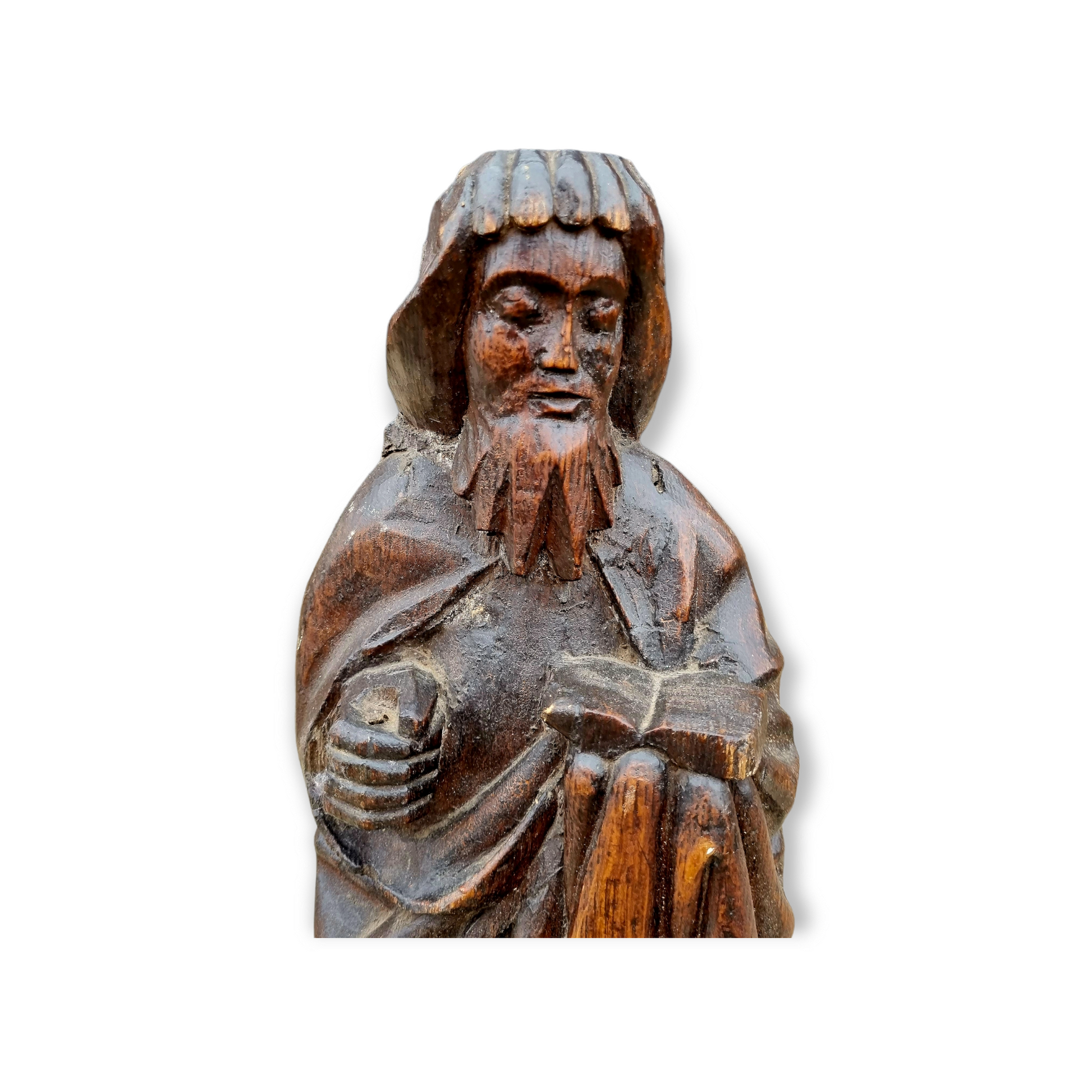 A 15thC English antique carved oak sculpture of a Saint, swathed in robes and depicted holding a book in his left hand. There is a rebate in his right hand which most probably accommodated a sword. The two symbols would have been representative of Saint Paul.
