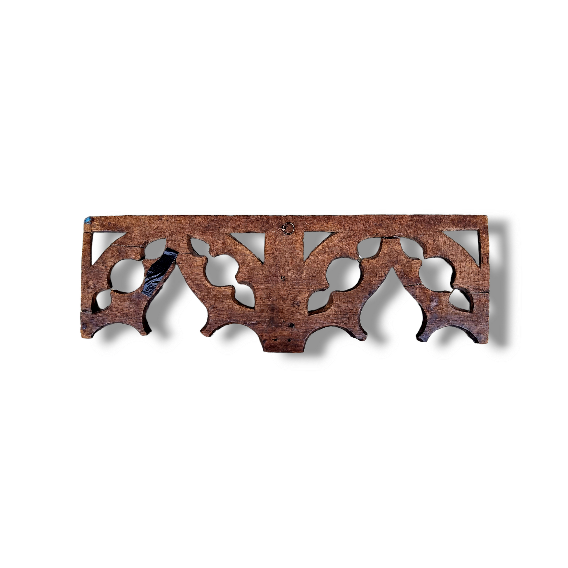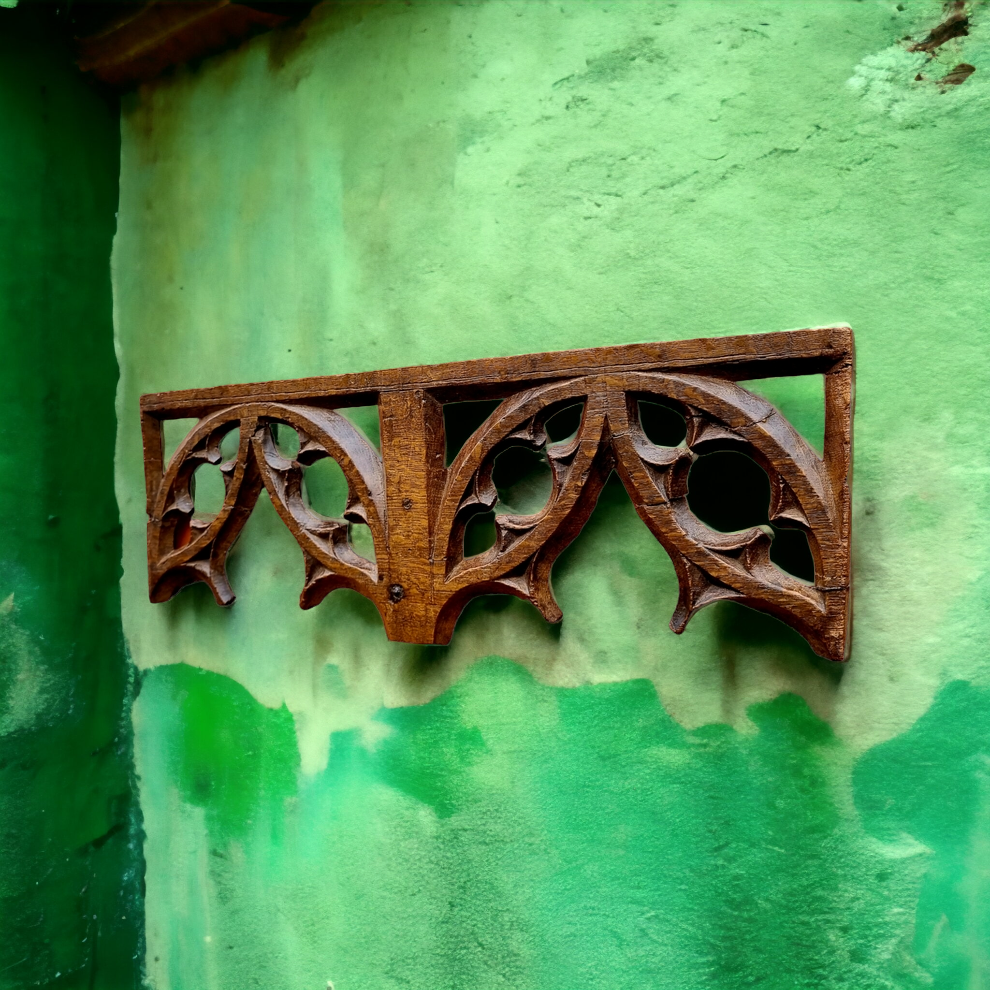 A striking fragment of 15th-century English Gothic tracery, carved in solid oak with deeply cut geometric and foliate motifs. Likely once part of a rood screen or ecclesiastical furnishing, this piece carries the quiet grandeur of medieval craftsmanship. Its weathered patina and architectural form evoke centuries of devotion and artistry, making it a compelling addition to any collection of religious antiques, period oak, or Gothic revival interiors. A rare survivor with both sculptural presence and historical resonance.
