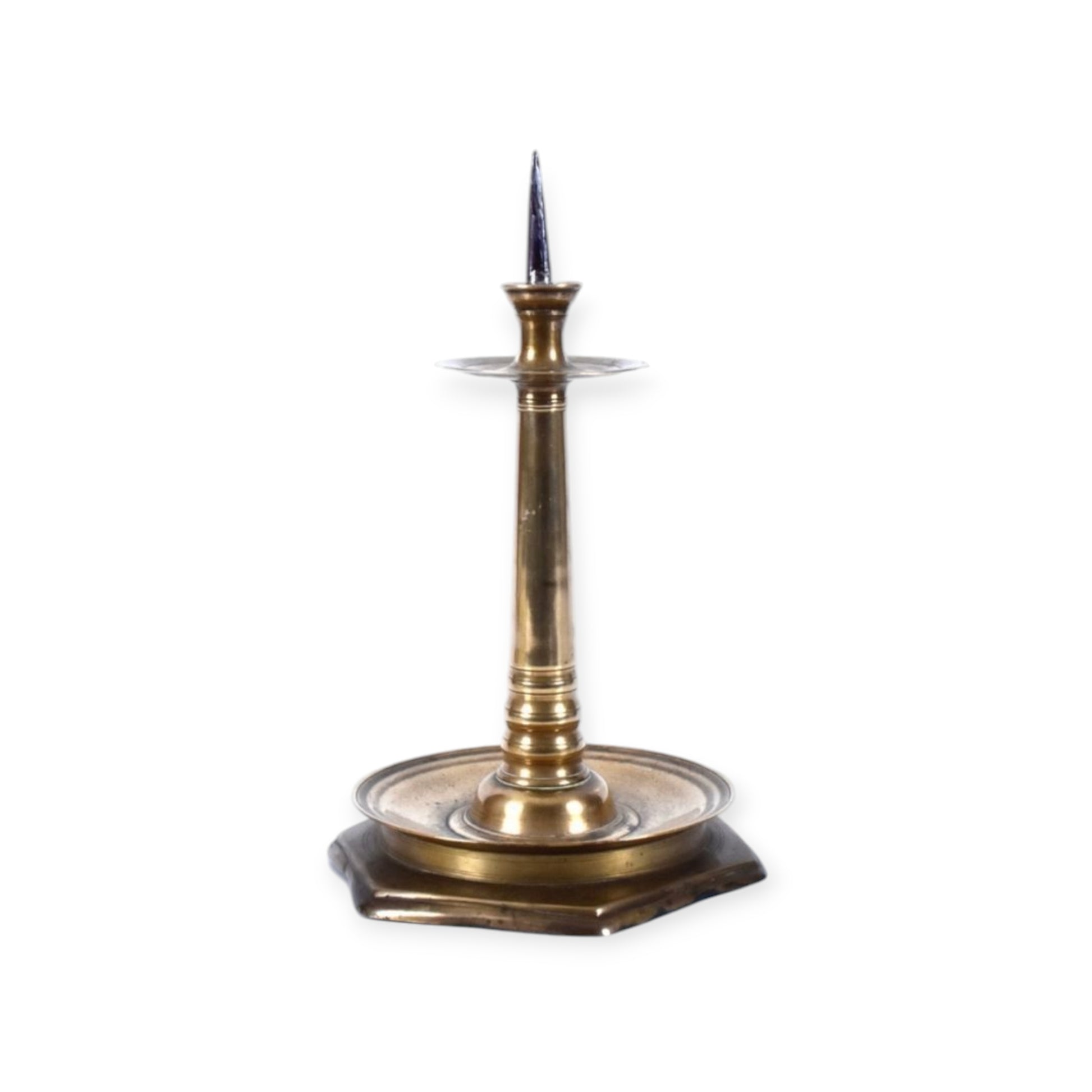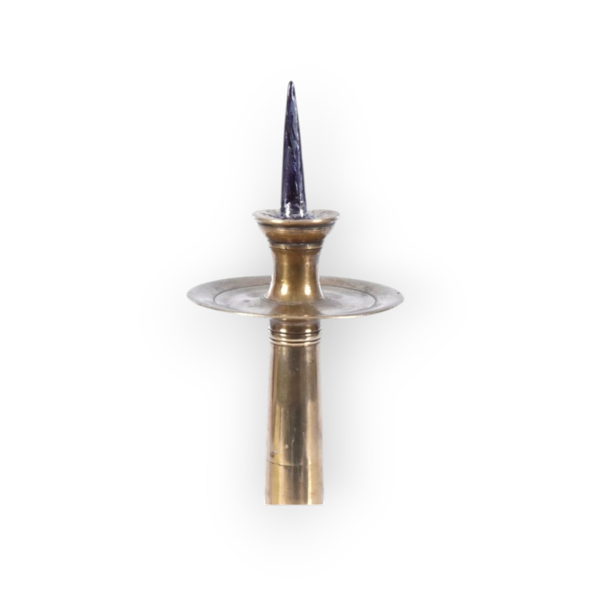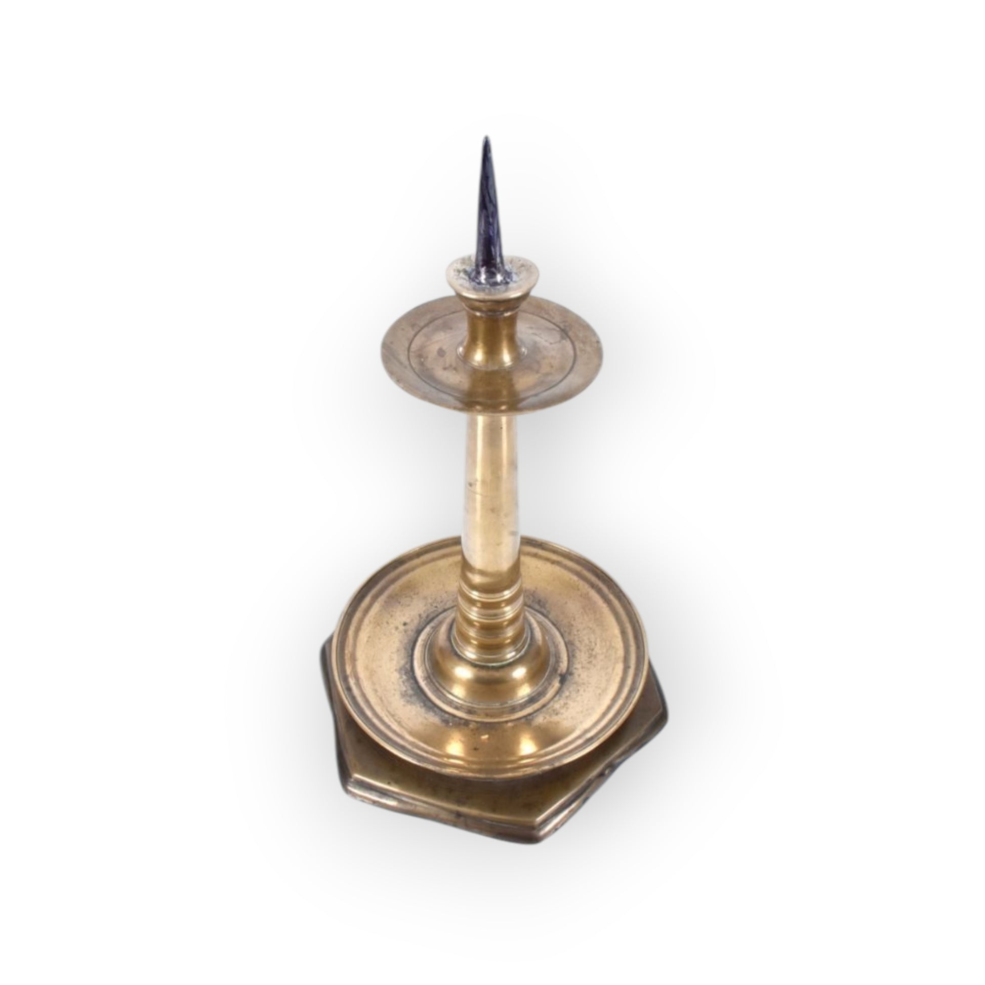 The top with a single steel alloy spike over a flared candleholder, a circular drip pan below, an elongated, flared stem with three knops at the bottom and a slightly bell-shaped base and an additional circular drip pan of larger diameter, and a stepped hexagonal foot.
