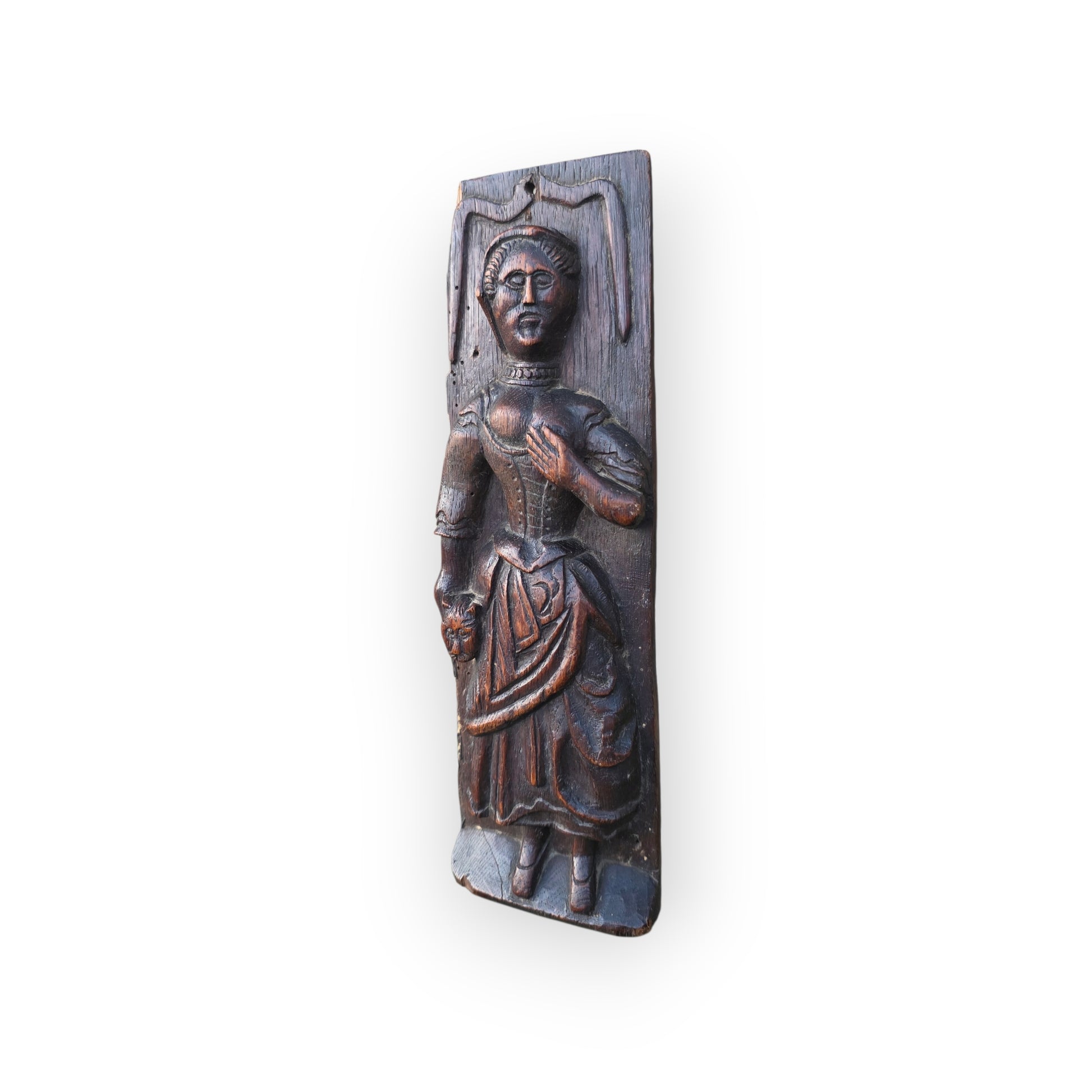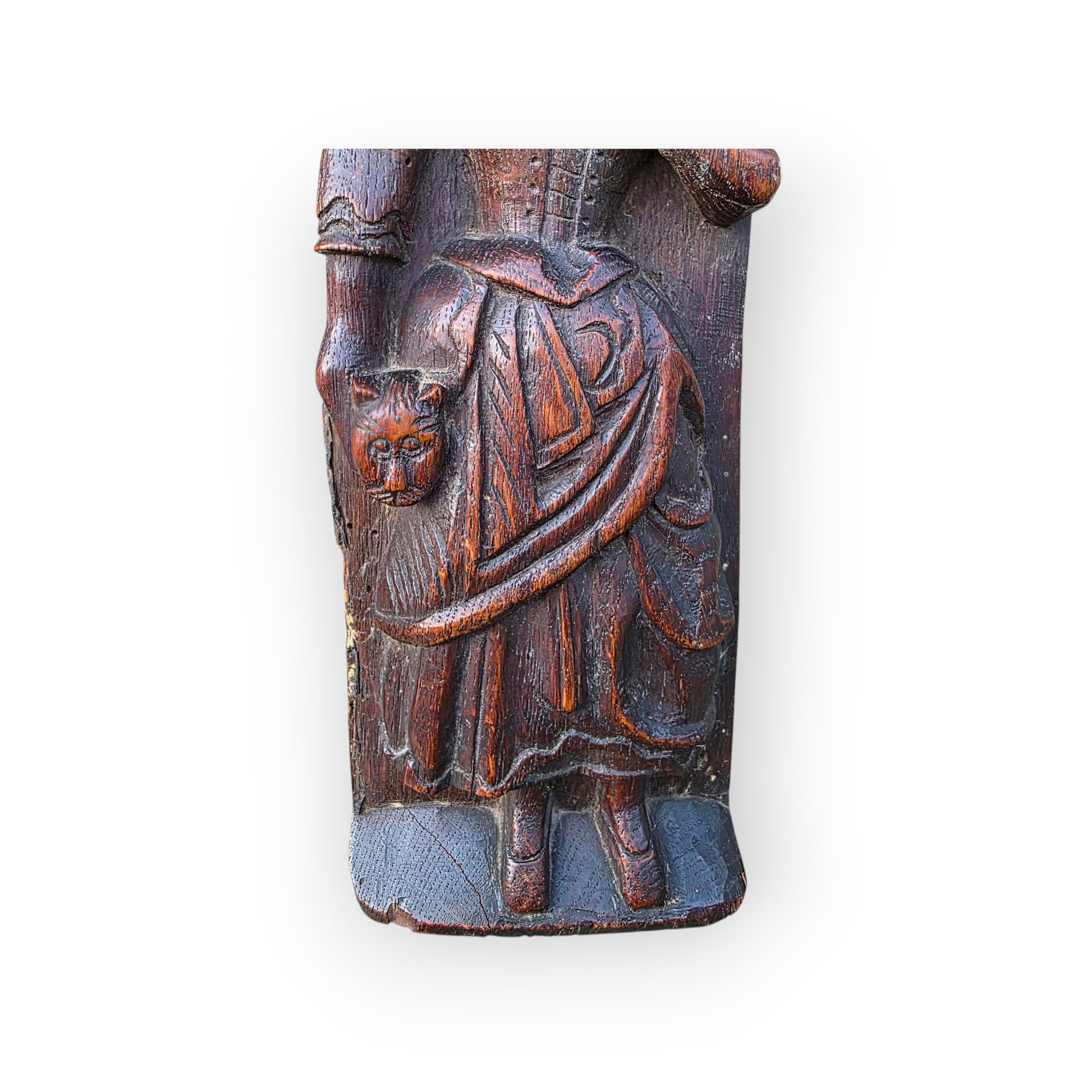 16th/17th‑Century Carved Oak Figural Panel – Depicting Fortitude With a Cat