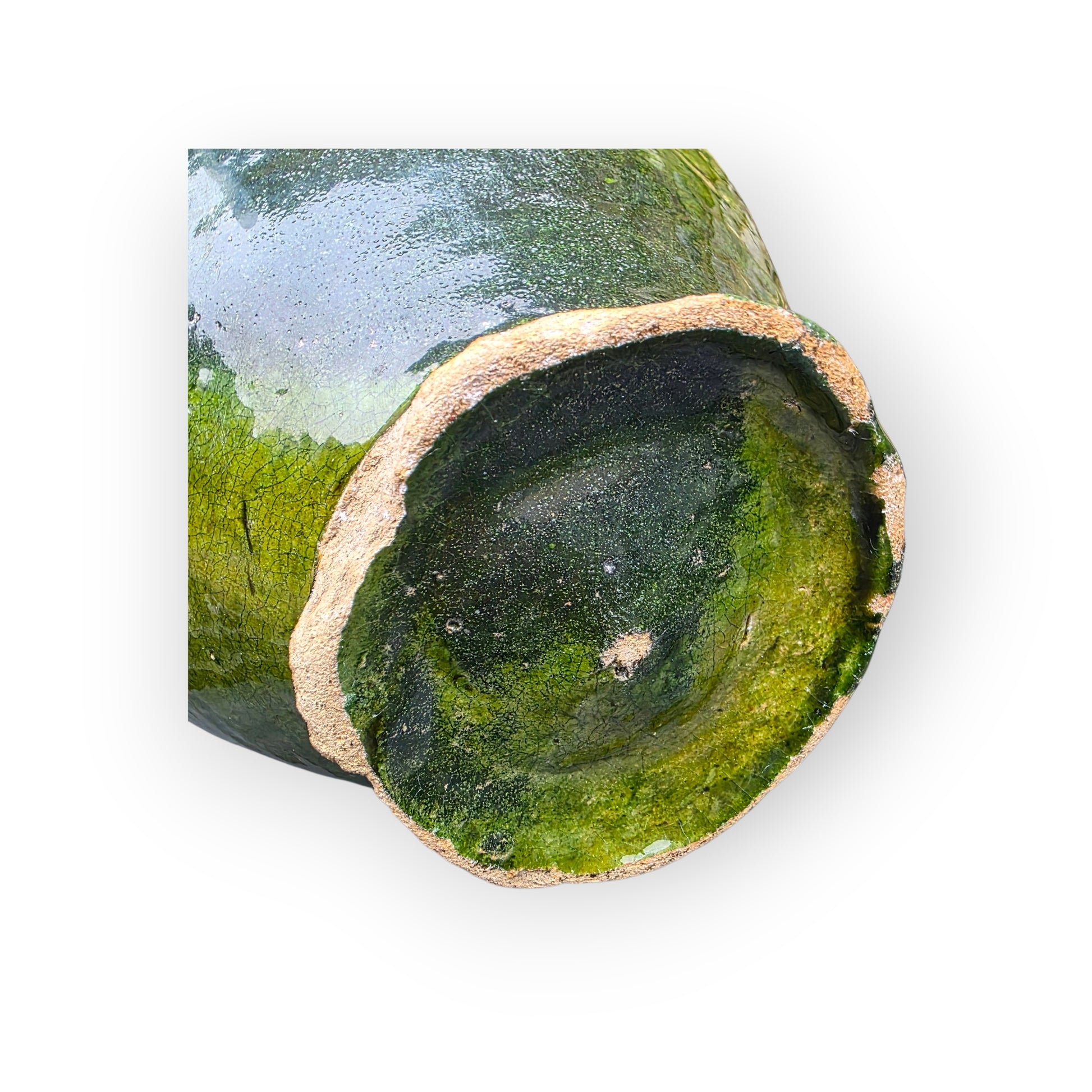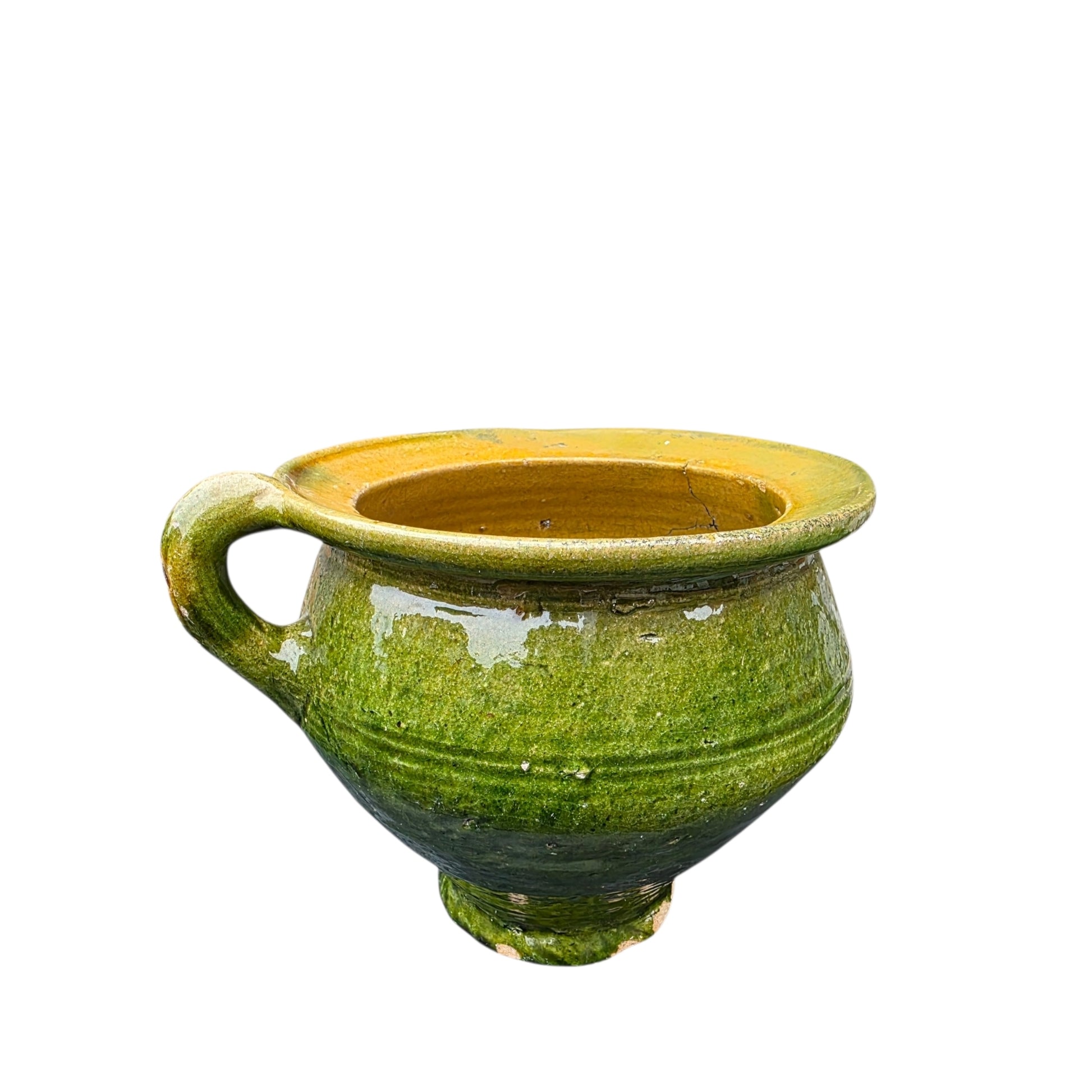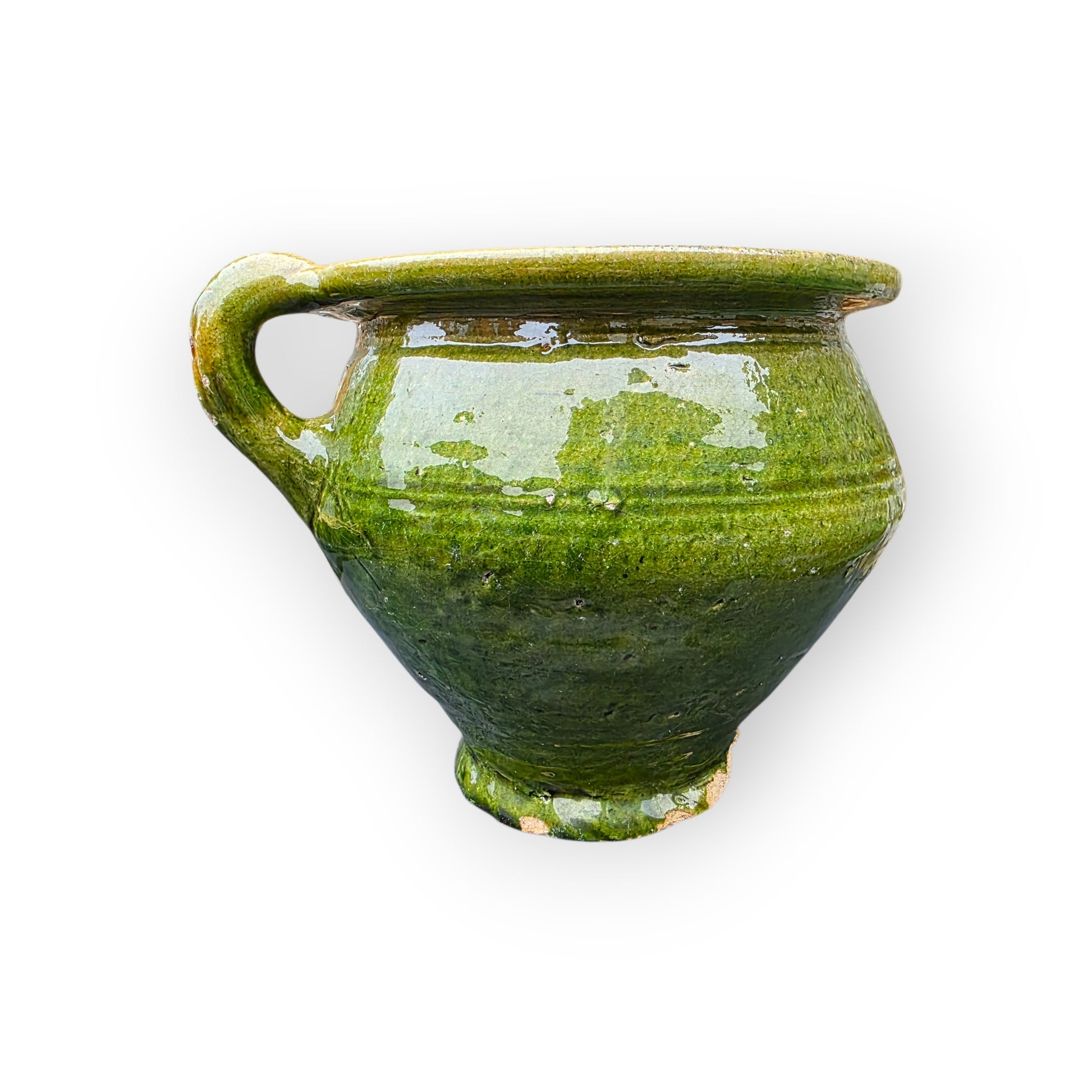 Condition: Lead‑glazed earthenware with a green glaze and a treacly finish. Wide mouth, single handle, rounded belly. Age‑related wear, glaze losses and fritting, specifically to the outer rim of the base. Surface marks. The upper rim has had an element of sympathetic restoration. Structurally sound overall. Photos show the actual item.