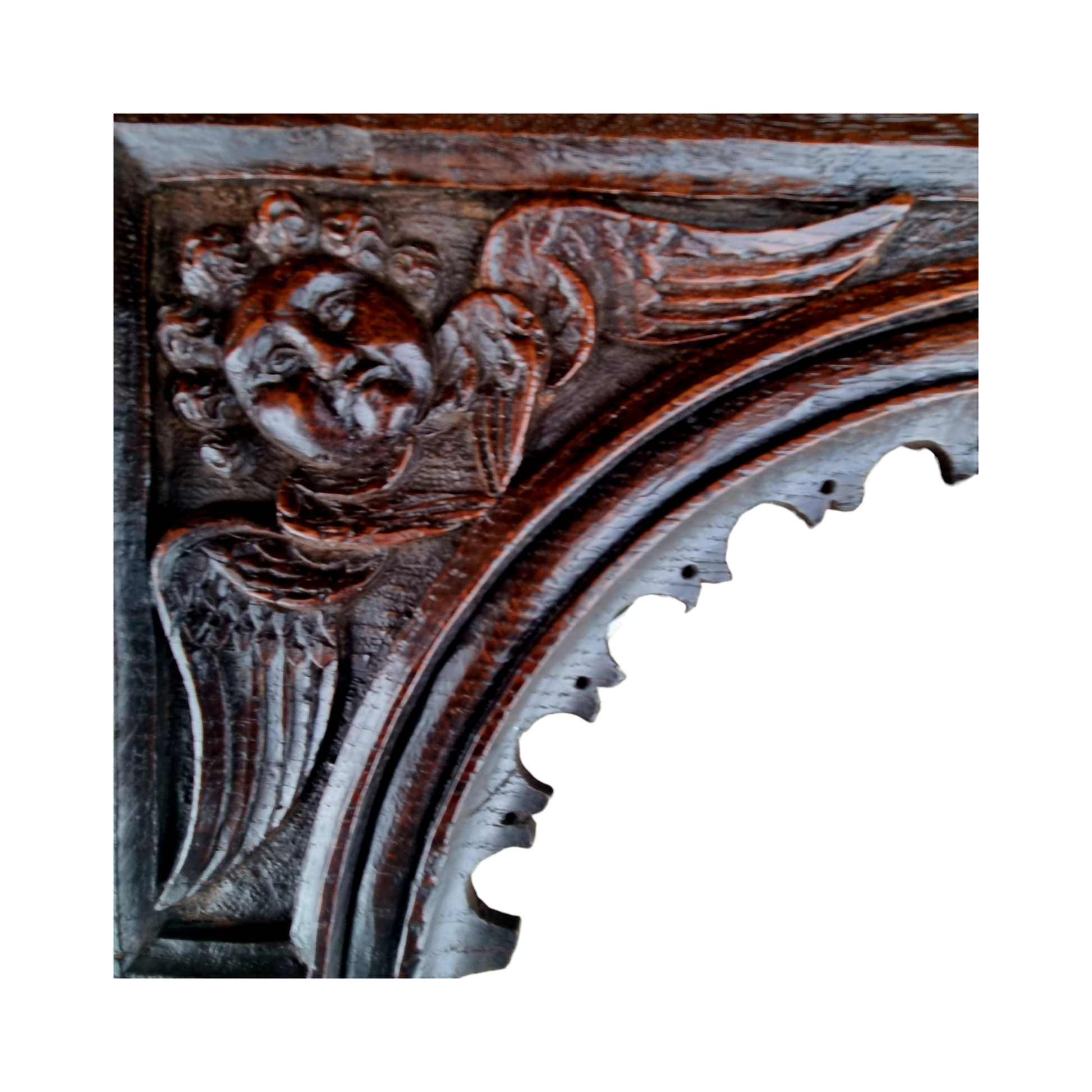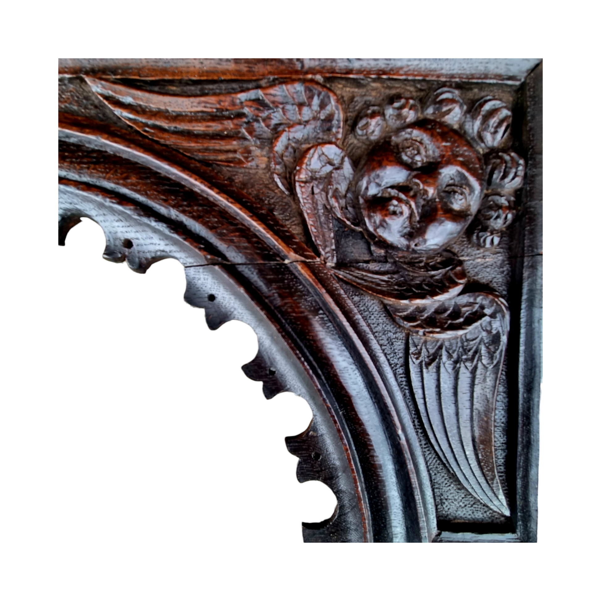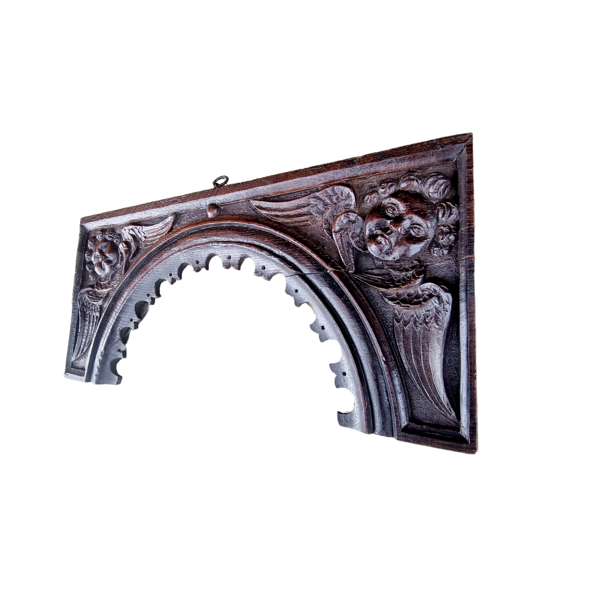 Possibly once forming part of a decorative adornment to a piece of 16th-century oak furniture, the carving features carved winged cherubs to each corner spandrel and decorative moulding to the inner-part of the arcade (arch) and scalloped carving to its outer edge.