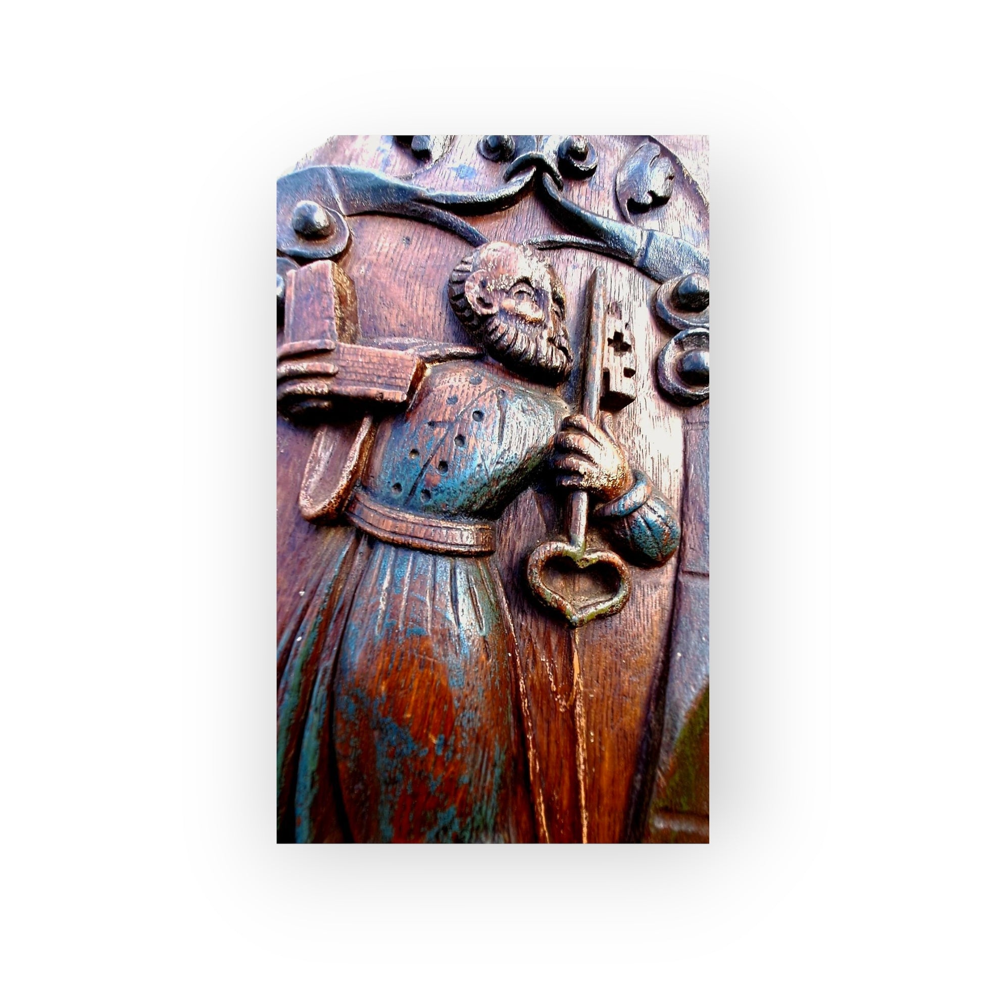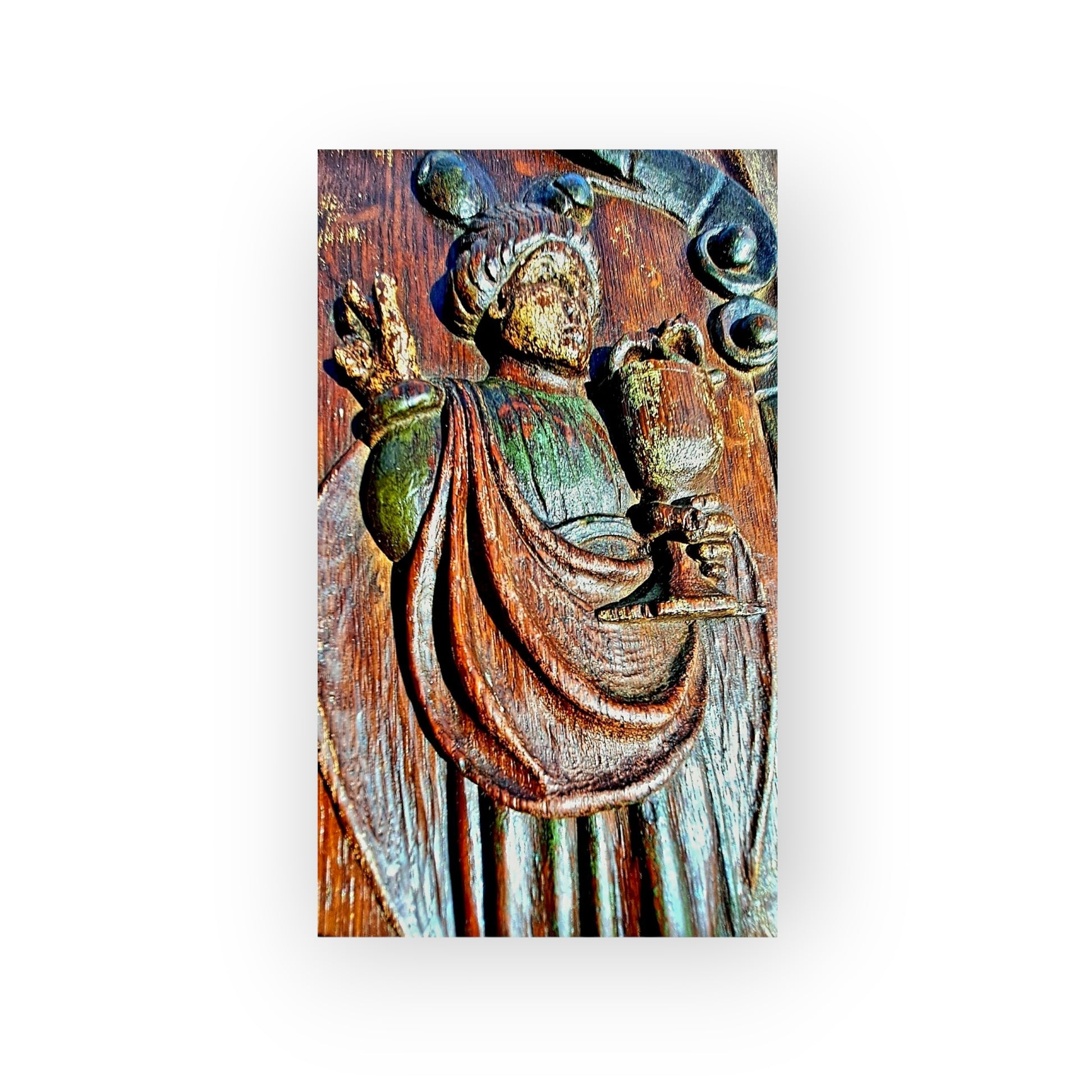 - Saint Holding a Chalice (Second from Left): This figure prominently holds a Chalice (or Cup). This is the unmistakable attribute of Saint John the Evangelist, often depicted with a chalice from which a serpent or small dragon emerges, symbolizing the poisoned wine he was forced to drink but miraculously survived. The gentle, contemplative pose aligns with his traditional depiction.