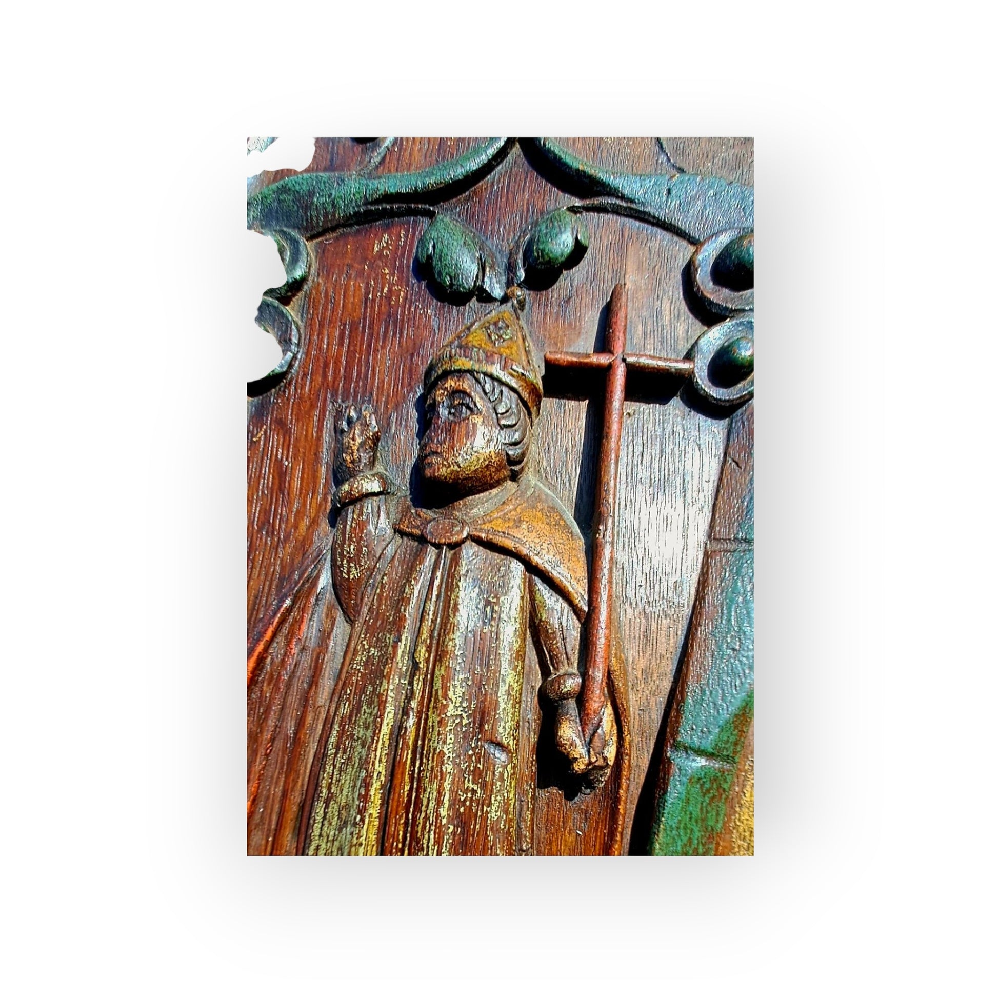 - Saint Holding Bread/Loaves (Third from Left): The third saint holds what appears to be a small loaf of bread or multiple small loaves, or possibly stones. This attribute is most commonly associated with Saint Philip the Apostle, who is known for the Biblical account where Christ tested him about how to feed the multitude (John 6:5–7). Alternatively, the small, round objects could be stones, the attribute of a martyred figure such as Saint Stephen (the first martyr).