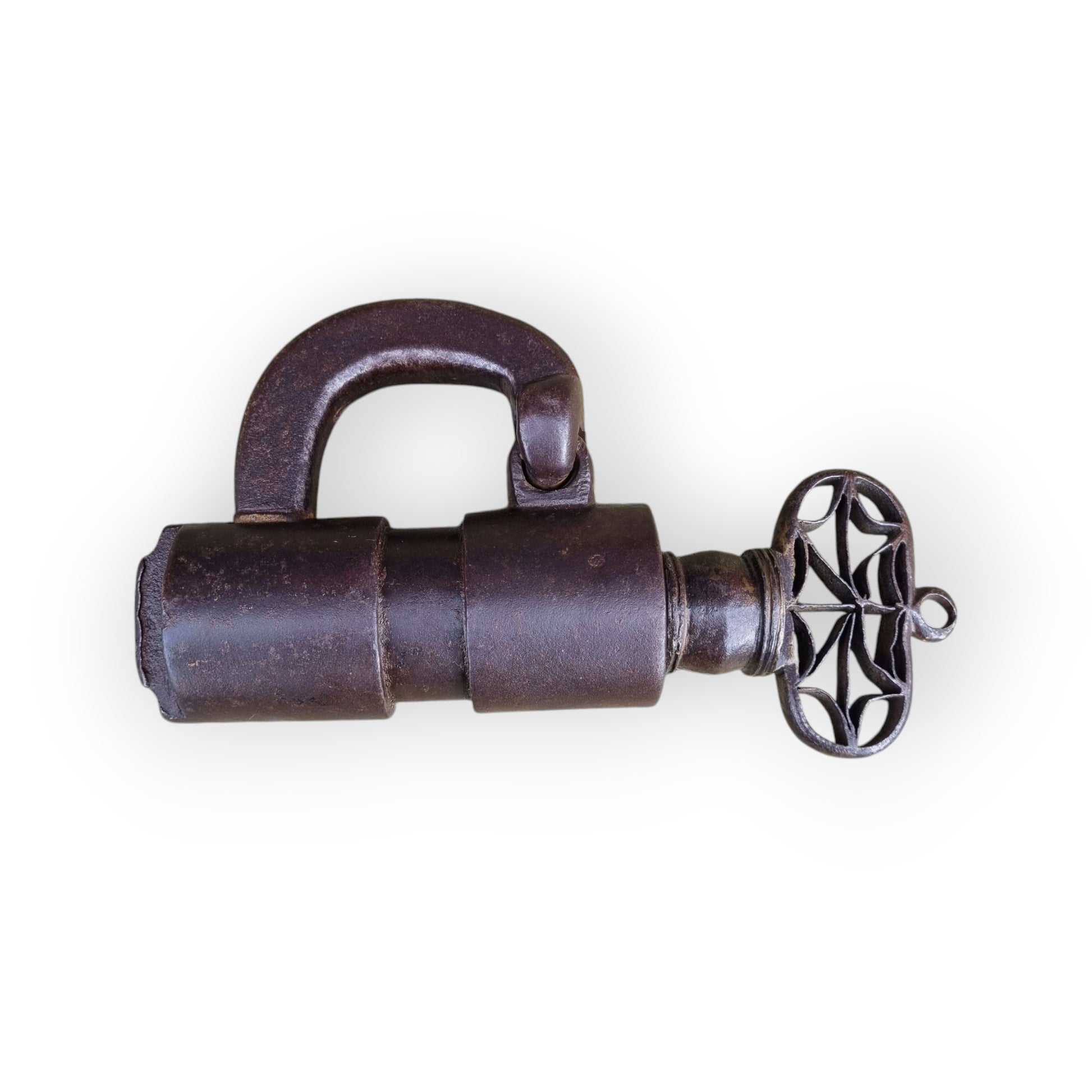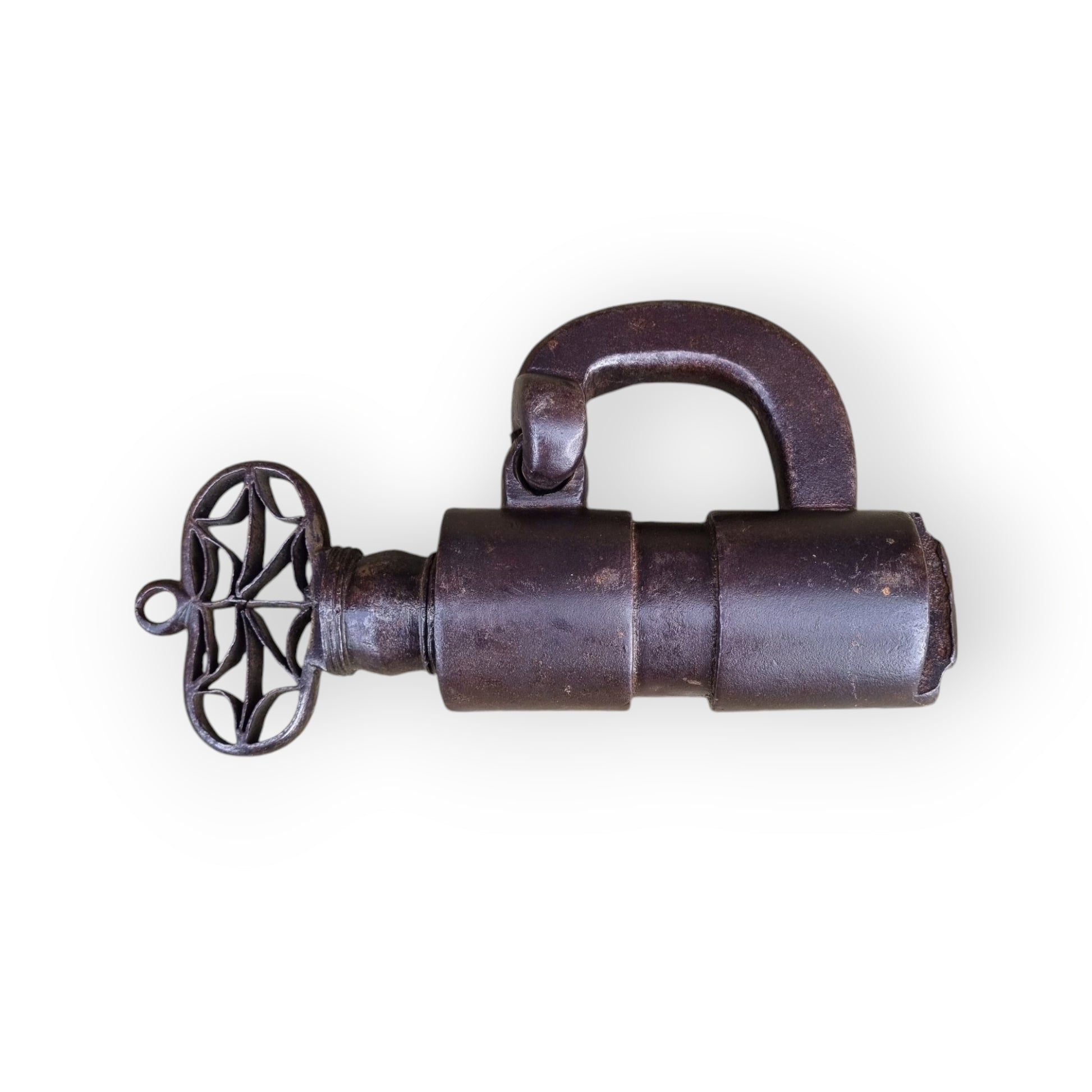 With a substantial shank joined to the barrel by way of a single hinge and it's original ornate key with reticulated bow (handle).