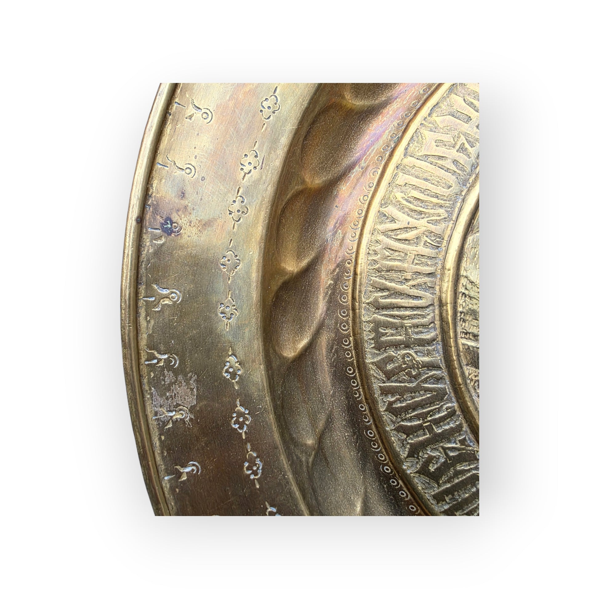 Reading the Text: The script is a stylised form of Cyrillic with repeated characters. Notice how the same character clusters repeat around the circle. In original 16th-century brassware, these inscriptions were often "nonsense" or "mock" inscriptions used for decorative purposes by illiterate craftsmen; in the 19th century, they were used to provide "authentic" atmosphere.