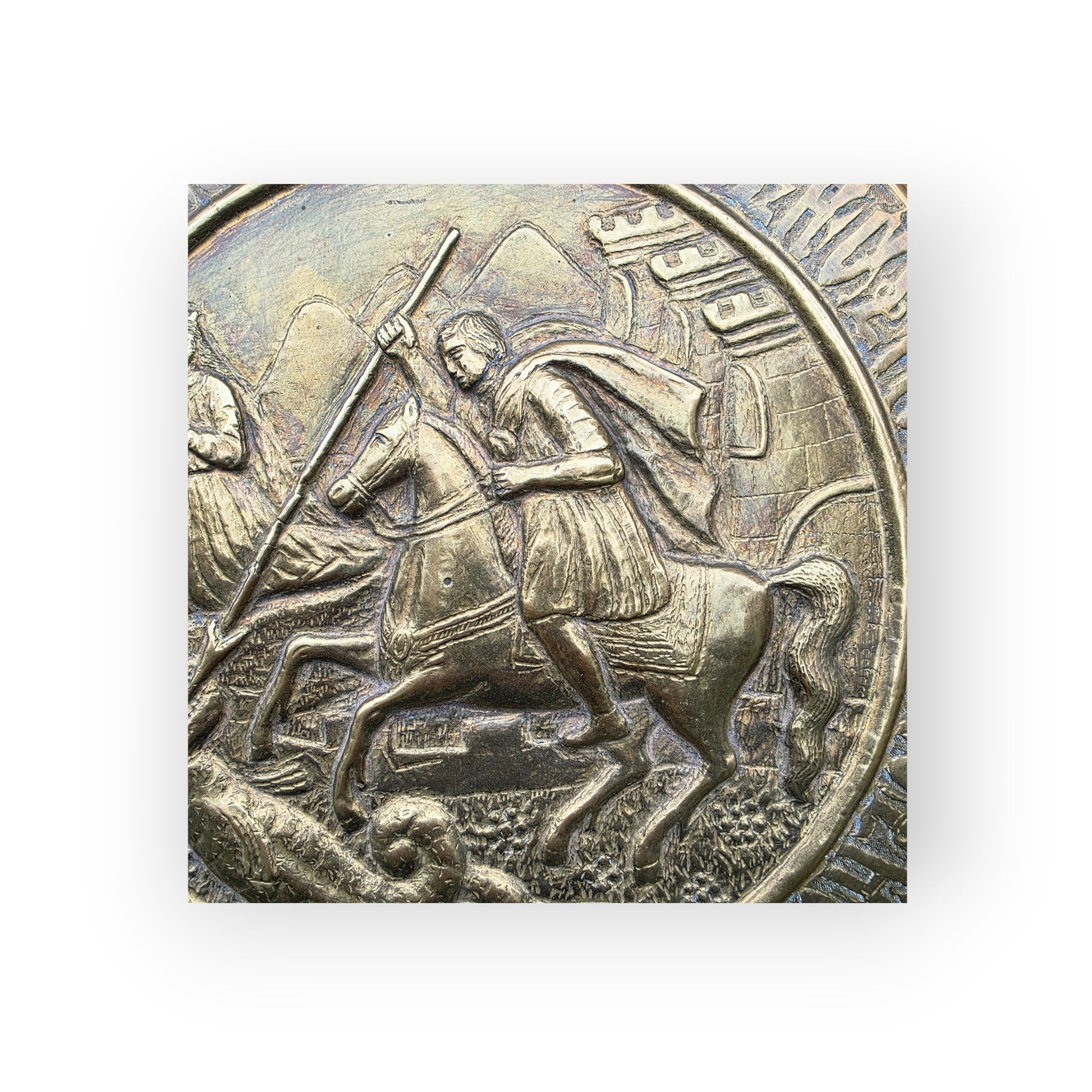 The Scene: This depicts St. George and the Dragon. St. George is shown on horseback, piercing the dragon with a lance, while the princess (cleverly placed in the background) prays for his victory.