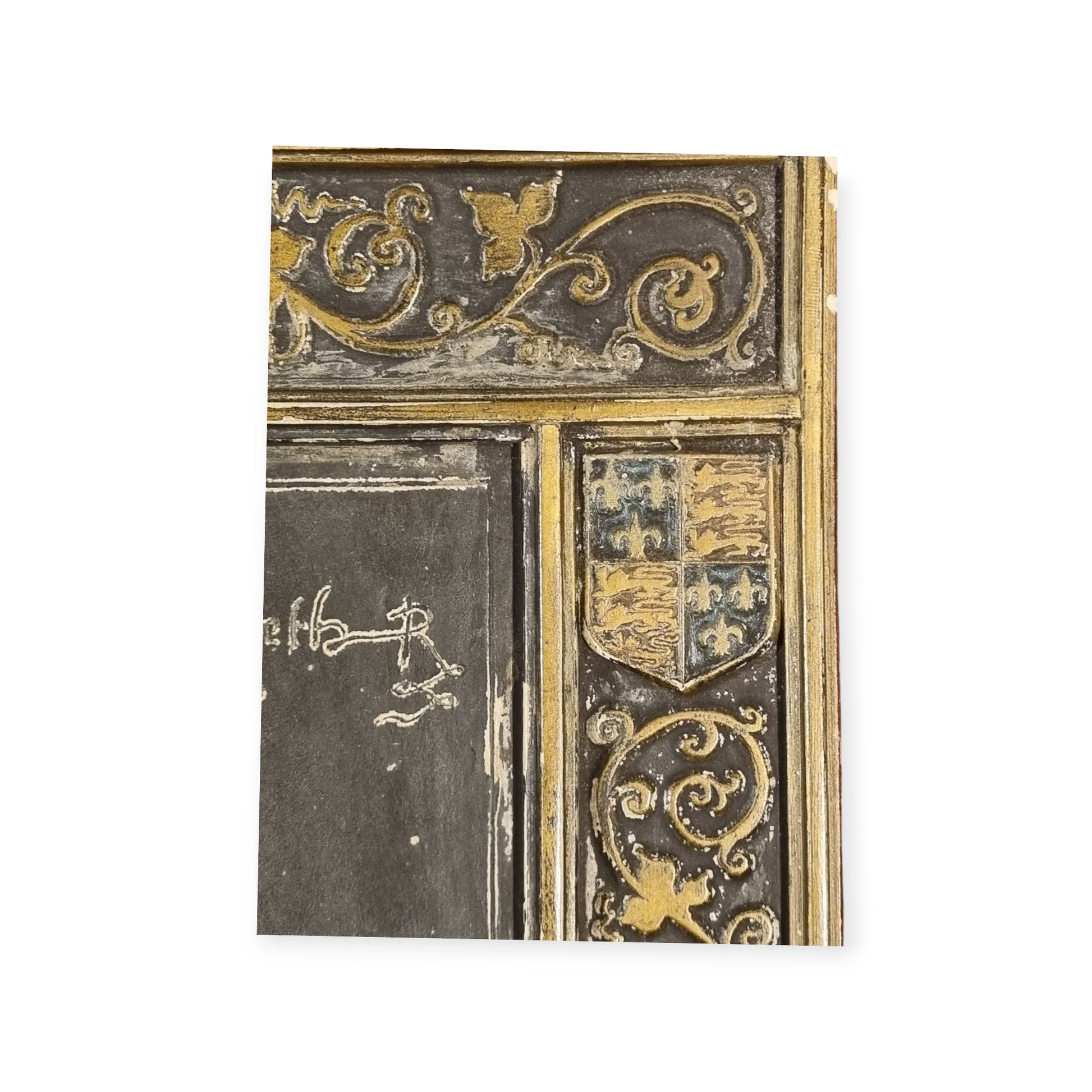 To the centre, in very fine detail, is a full-length figure of Elizabeth I. Beautifully decorated in polychrome. A date of "1558" is cast into the plaque above her right shoulder. This commemorates her accession to the English throne as English Monarch in November of that year after the death of her half-sister Mary I. To the right, above her left shoulder, a copy of her signature has been cast.