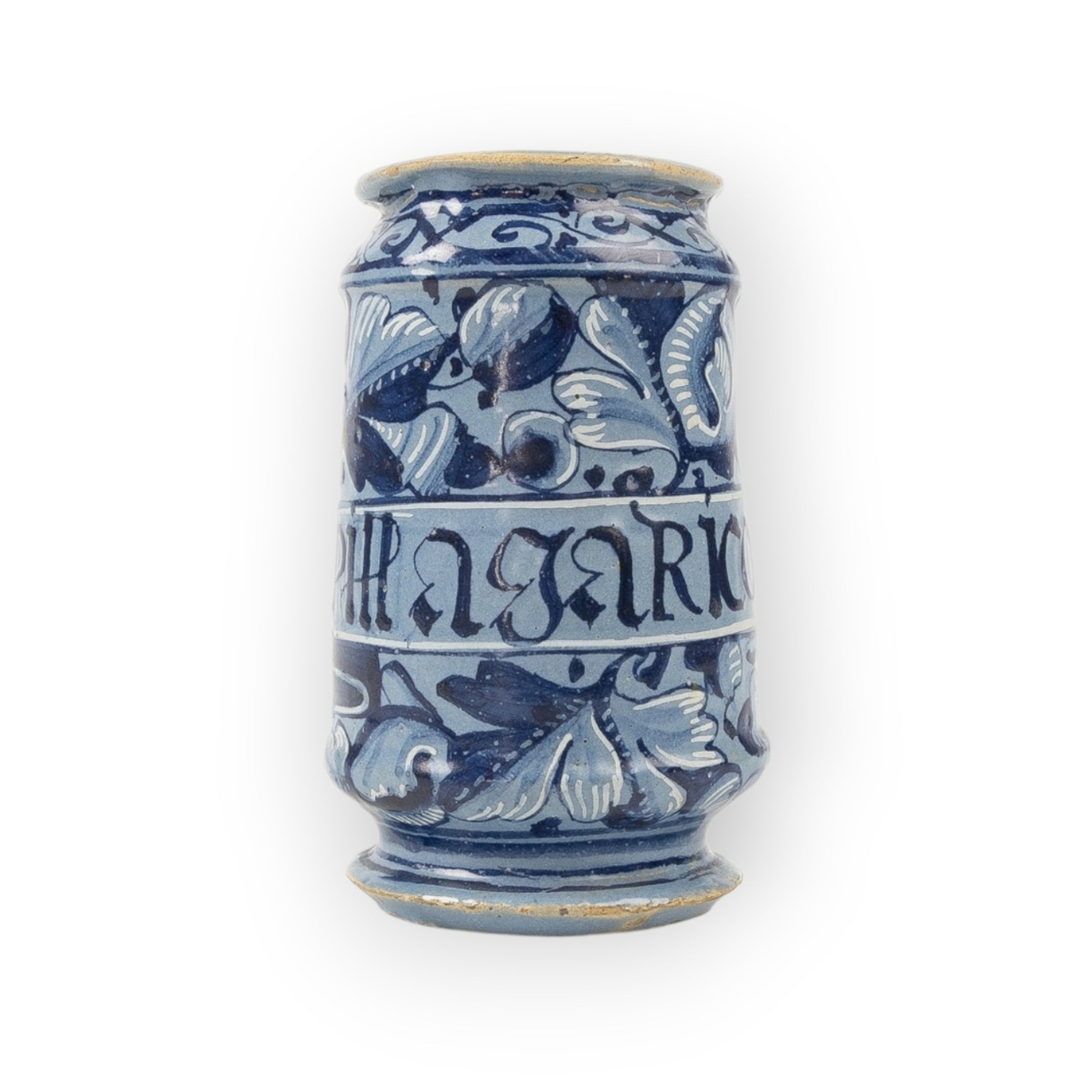 This late 17th‑century faience albarello apothecary jar is decorated in blue foliate scrolls on a pale tin‑glazed ground, with a central label reading “PILL: ASARICOTROCSICA” — a longer, more specific form of the medicinal term asaric. The inscription refers to Pillulae Asarici Trochisci, a compounded pharmaceutical preparation made from asarabacca (Asarum europaeum), a potent herb used historically as a purgative and emetic.