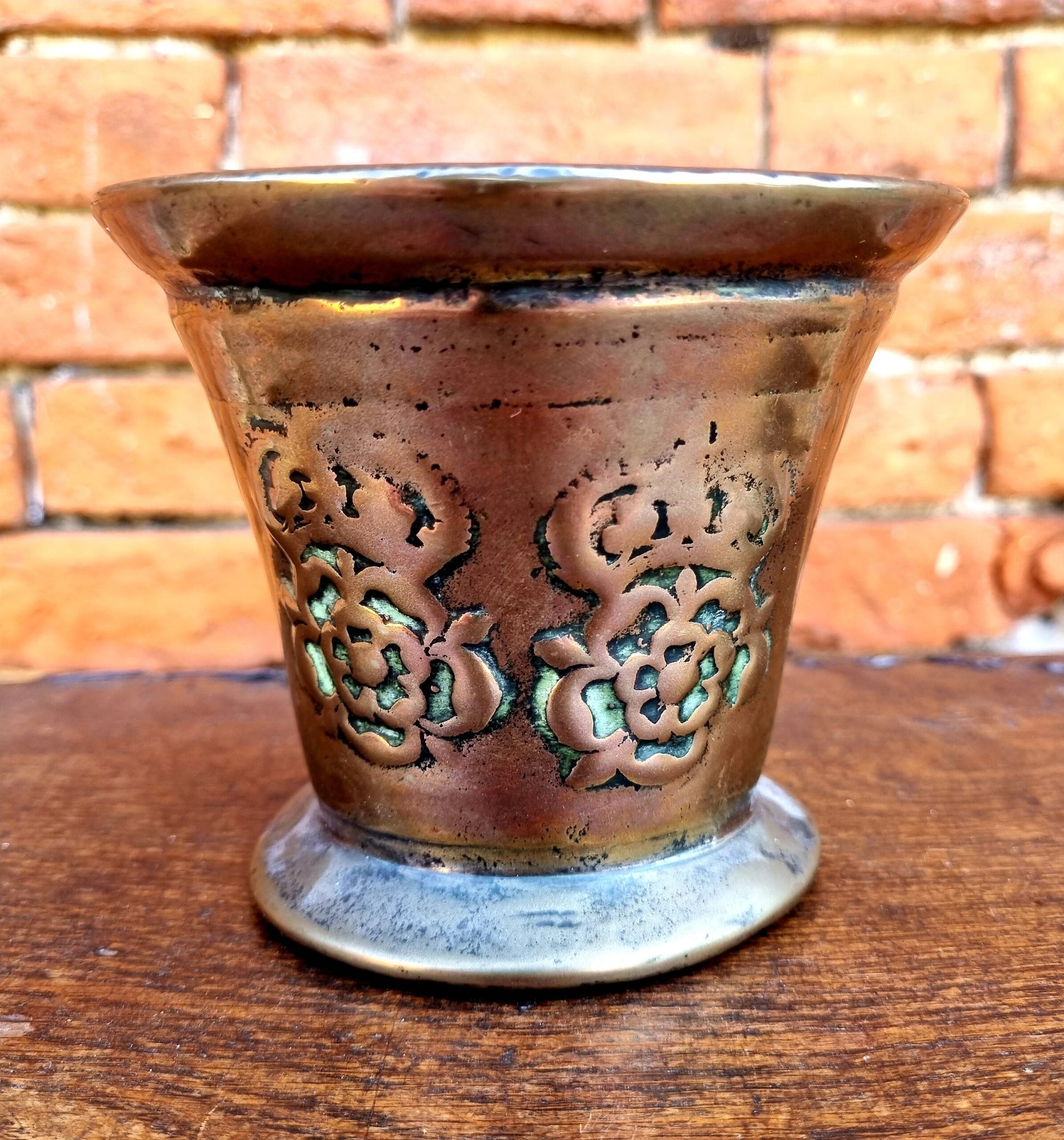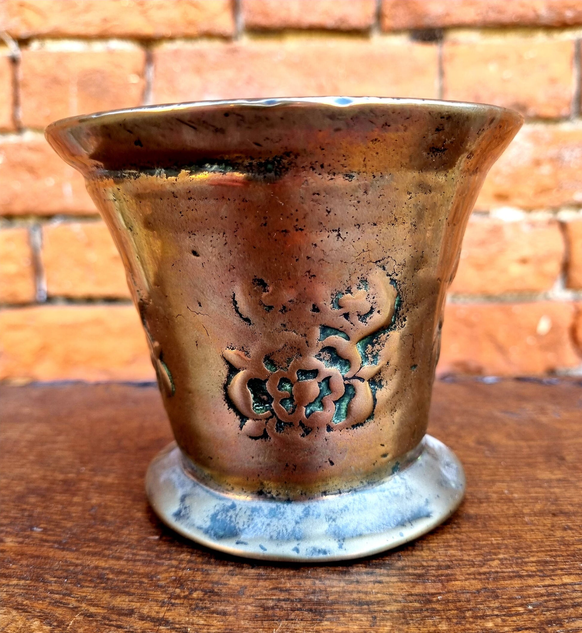 17th Century English antique London-made bronze mortar, the outer surface bearing four cast Crowned Tudor Roses.